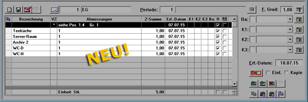▶ Die kopierten Kleinflächen-Aufmaßzeilen werden an die markierte Zuschlagsposition angehängt. Die Spalte Abmessungen zeigt für jede Kleinflächen-Aufmaßzeile den Wert "1". Die zur Zuschlagsposition zugeordneten Kleinflächen werden jeweils als 'ein Stück' abgerechnet:
