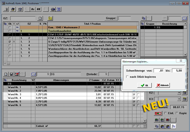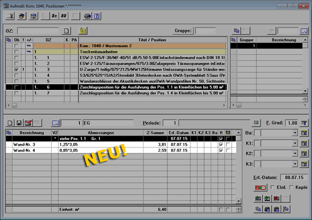 - Markieren Sie im Menüpunkt Aufmaß: Kom. die Position, die Aufmaße für Kleinflächen enthält.