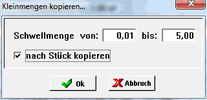 . ▶ Das Dialogfenster Kleinmengen kopieren erscheint und zeigt zwei Textfelder mit voreingestellten Schwellenwerten (0,01 bis 5,00 m²) an. Sie können bei Bedarf diese Schwellenwerte ändern.